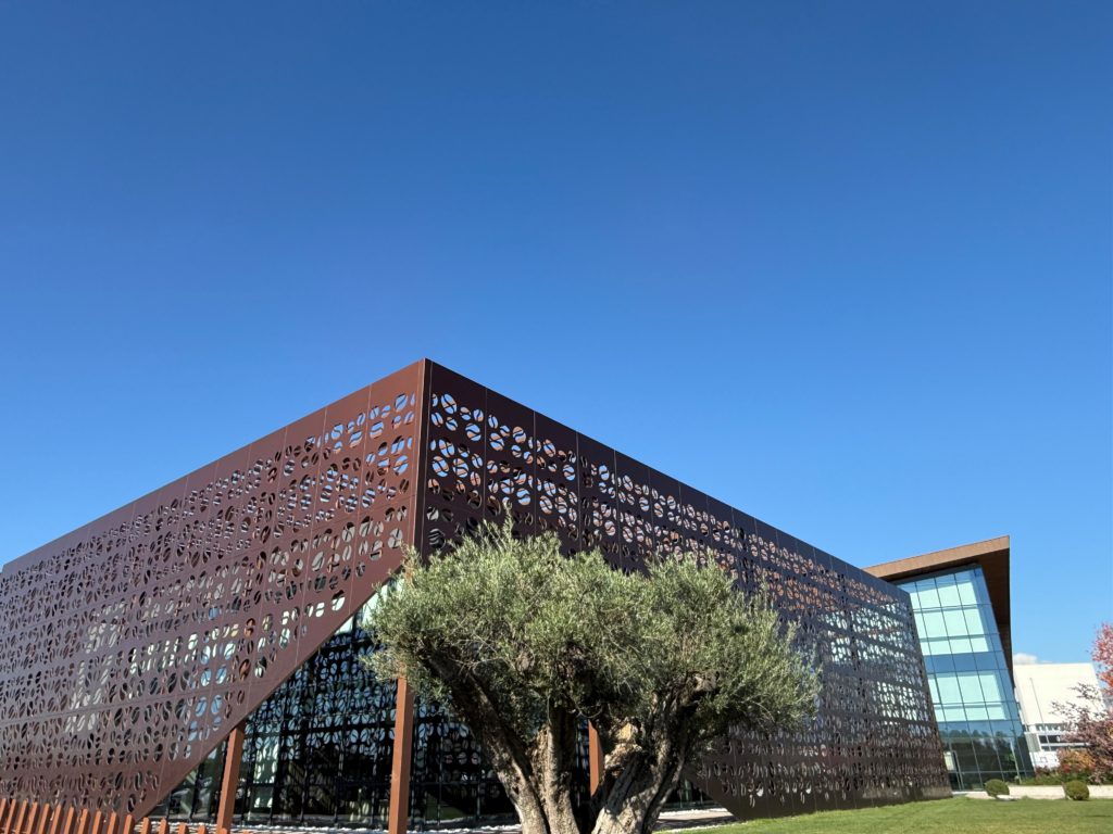 Un rivestimento con pannelli HPL Trespa che lascia senza fiato grazie ad una lavorazione di fresatura completamente personalizza che richiama già da fuori l'identità dell'azienda